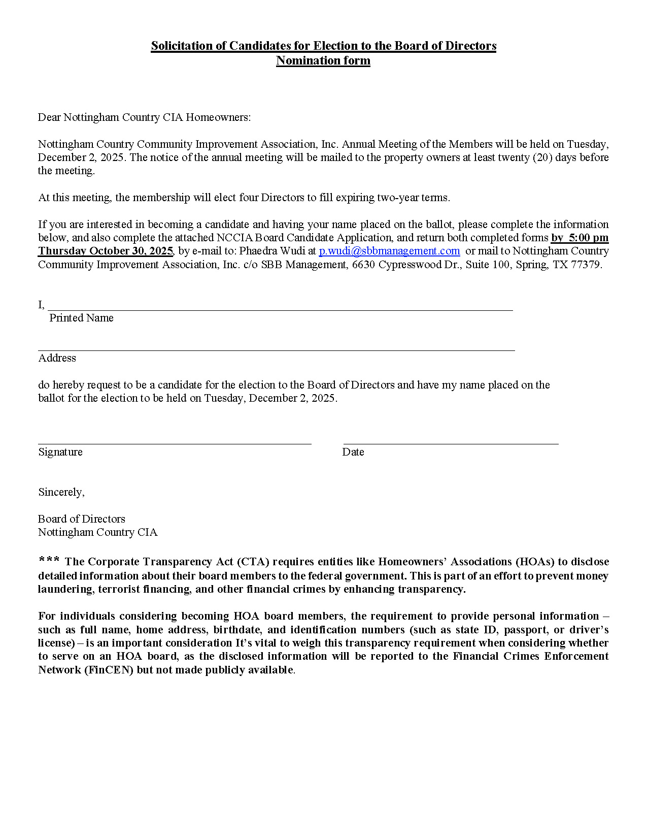 Call for Candidates: Nottingham Country CIA Seeks Homeowners to Join 2026–2027 HOA Board