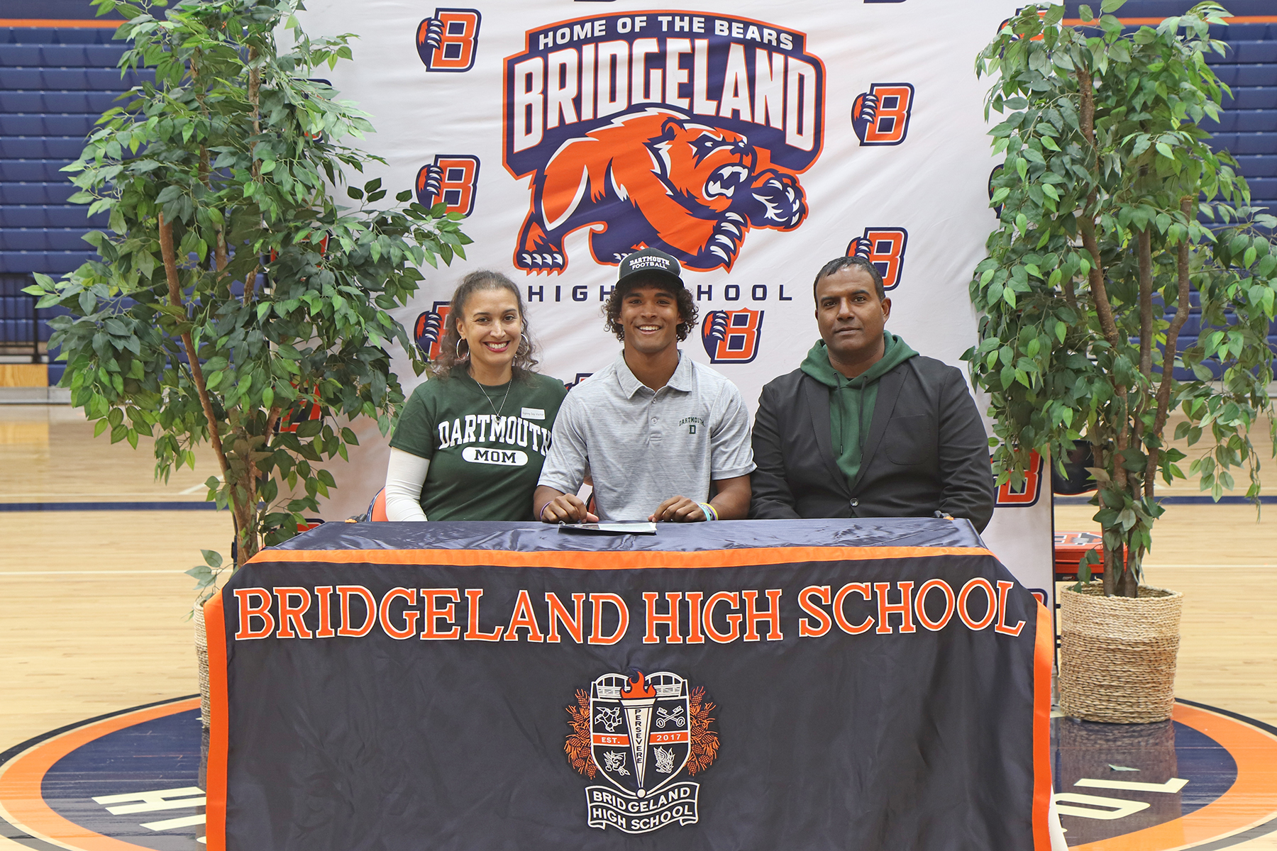 Bridgeland High School senior Jonathan Nelson, center, signed a letter of intent to play football at Dartmouth College. (Photo by Avery McGoldrick, Bridgeland HS)