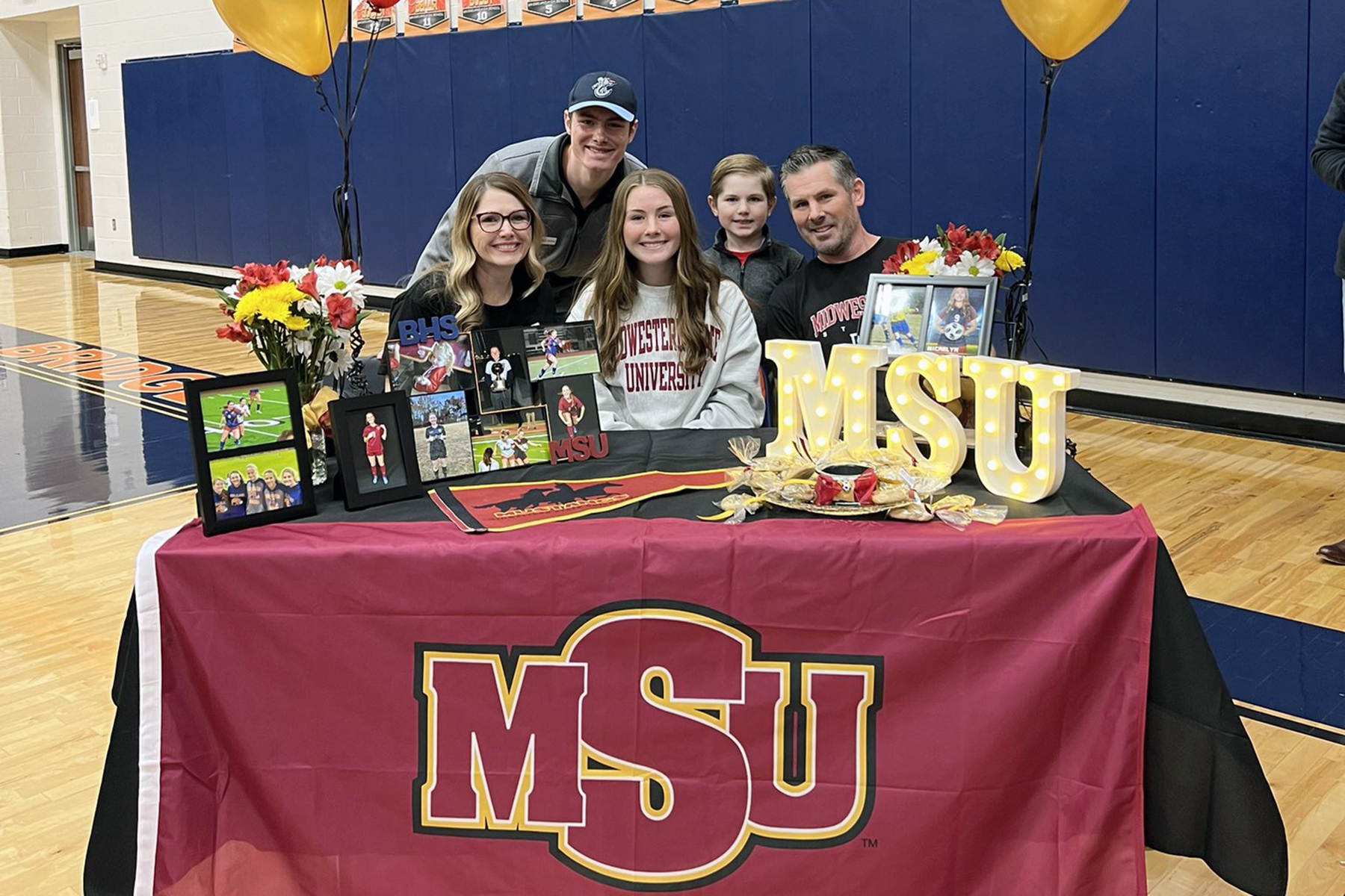 Bridgeland High School senior Micaelyn Carstens, seated center, poses with her family after signing a letter of intent to play soccer at Midwestern State University.