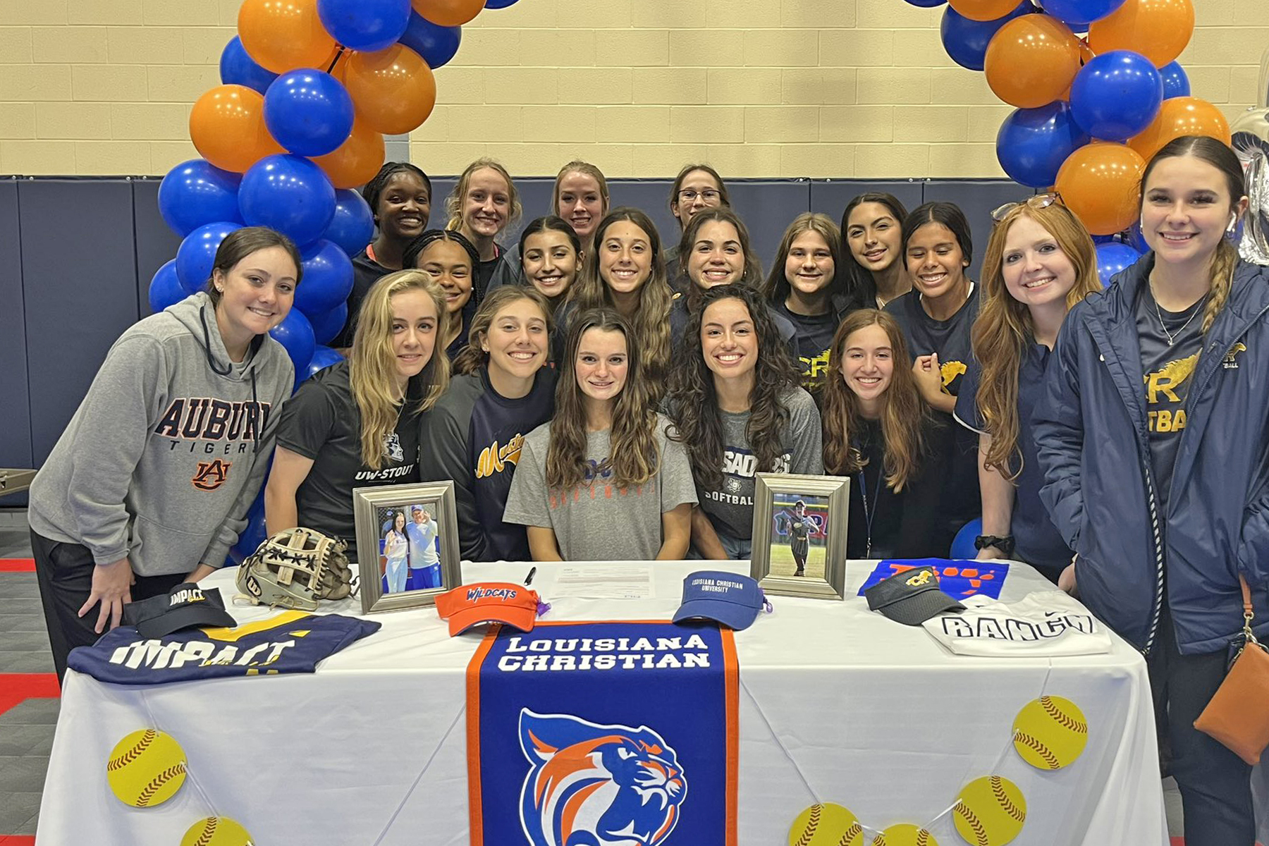Cypress Ranch High School senior Emily Landry, seated center, smiles after signing a letter of intent to Louisiana Christian University.