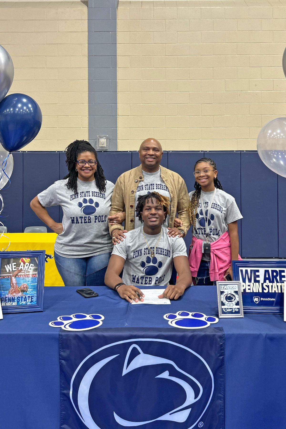 Cypress Ranch High School senior Zavion Reed, seated, poses with his family after signing a letter of intent to play water polo at Penn State Behrend.