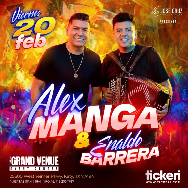 Alex Manga & Enaldo Barrera bring an energetic live vallenato and tropical-music show to The Grand Venue Event Center in Katy.