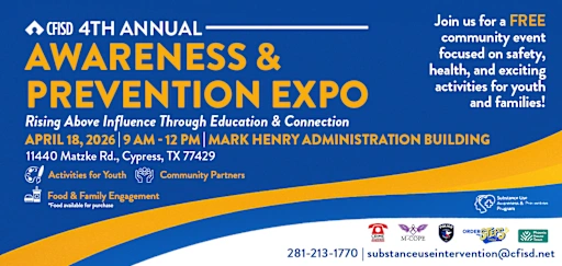 The CFISD 4th Annual Awareness & Prevention Expo will be held at the Mark Henry Administration Building in Cypress, bringing neighbors together for safety, health and prevention resources.