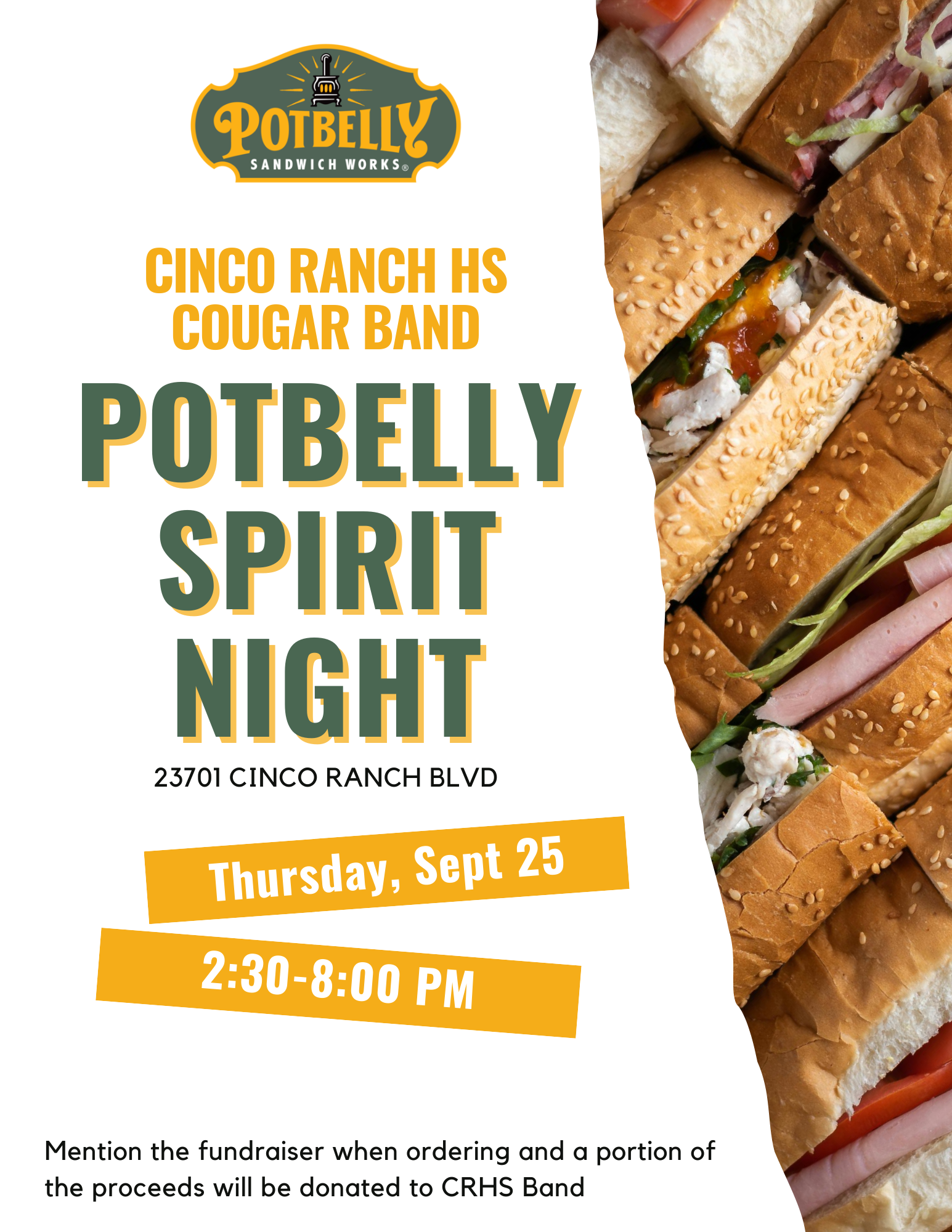 The Cinco Ranch High School Cougar Band is inviting the community to come together for a delicious evening of food and fundraising at Potbelly Sandwich Works, 23701 Cinco Ranch Blvd, Katy, TX, on Thursday, September 25, from 2:30 p.m. to 8:00 p.m.
