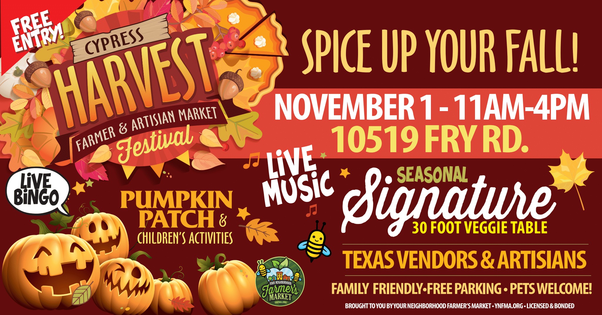 The Cypress Harvest Festival returns to Cypress with a vibrant farmers market experience in Cypress, TX. This family-friendly festival features farm-fresh produce, artisanal goods, live music, and a mini pumpkin patch—perfect for a weekend family outing.
