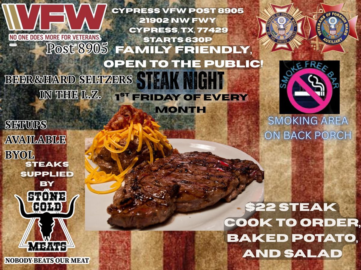Cypress VFW Steak Night at Cypress VFW Post 8905 in Cypress is an easygoing Friday-night tradition—good food, cold drinks, and neighbors catching up to start the weekend right.
