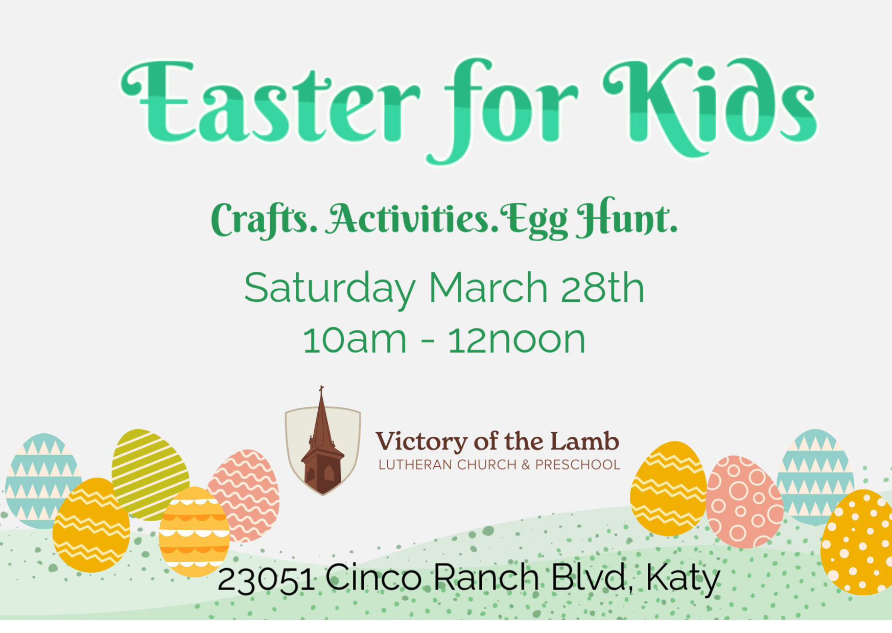 - Location: Victory of the Lamb Lutheran Church and Preschool, 23051 Cinco Ranch Blvd, Katy, TX 77450.