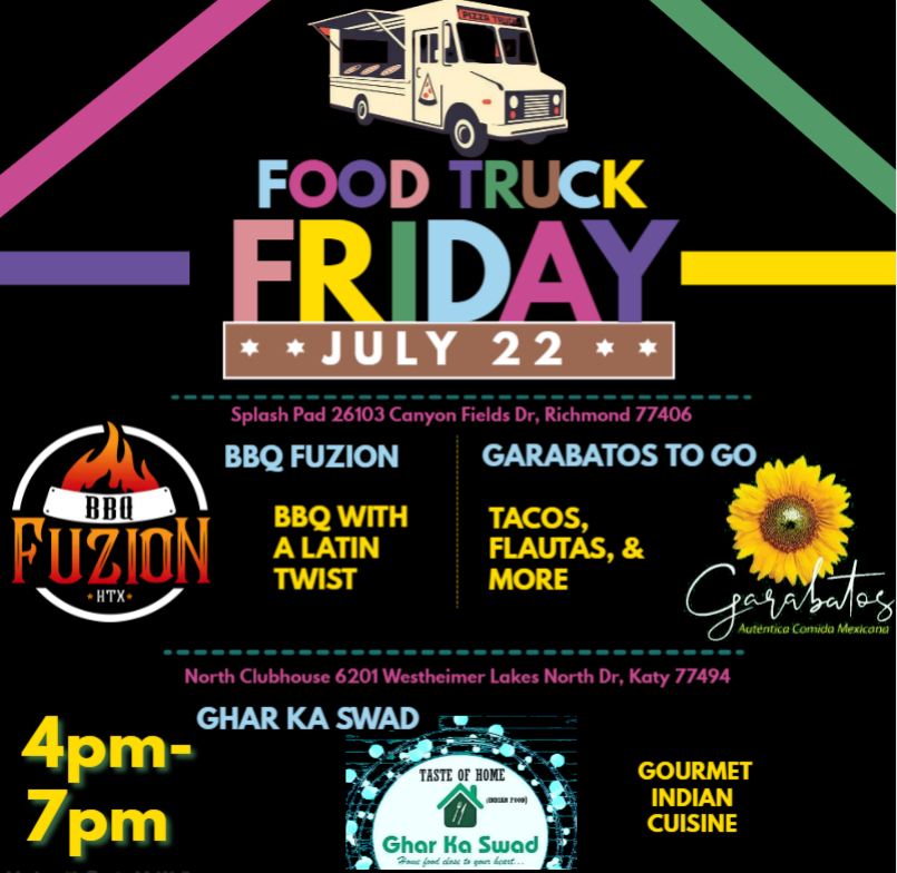 Skip the cooking next Friday and stop by the North or Splash Pad locations to enjoy something from one of our food trucks present! The North parking lot will host Ghar Ka Swad gourmet Indian cuisine. Garabatos To Go will join us again, at the Splash Pad along with BBQ Fuzion. Whether it’s BBQ with a latin twist, tacos, or butter chicken, come fulfill your taste buds to start your weekend!