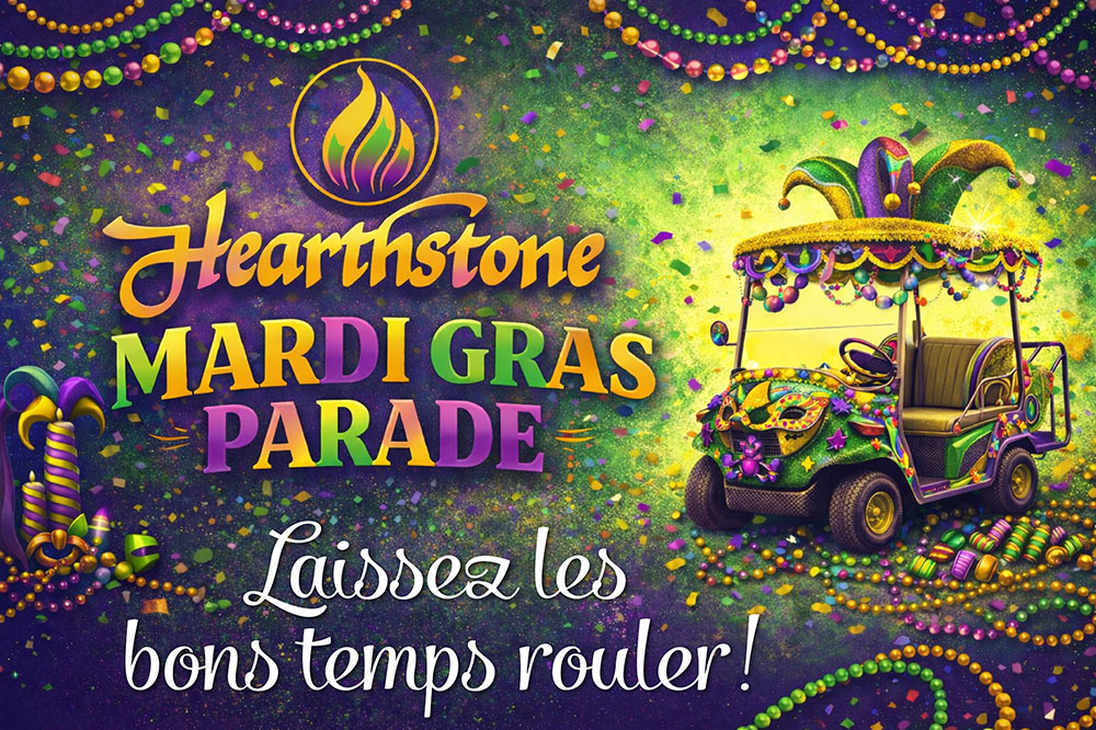 The 1st Annual Hearthstone Mardi Gras Parade will take place on Monday, February 16, 2026, at 5:00 PM, with all participating golf carts meeting near the intersection of Elmont and Ameswood. This is a resident-only event open exclusively to members of the Hearthstone community. The parade will feature music, beads, candy, festive golf carts, and plenty of family-friendly fun as it rolls through the neighborhood in true Mardi Gras spirit.
