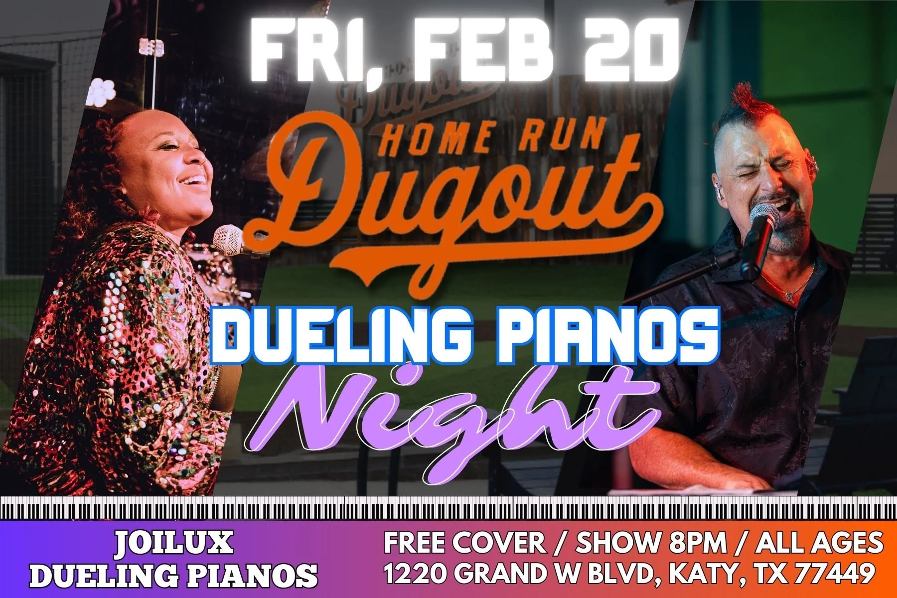 JoiLux Dueling Pianos performs at Home Run Dugout in Katy for an interactive, sing-along piano show that mixes humor and audience requests.