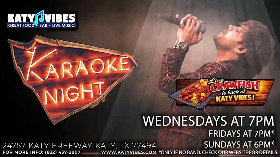 Karaoke Night + Live Crawfish at Katy Vibes in Katy is a social evening of open-mic singing, casual dining, and community fun.