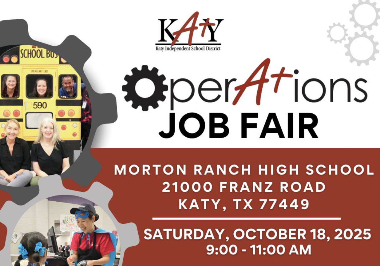 Looking for a job in Katy, TX? Come explore dozens of immediate job openings at the Katy ISD Operations Job Fair, taking place Saturday, October 18 at Morton Ranch High School. As the no. 1-ranked public school district in the Houston area, Katy ISD is hiring for full- and part-time positions in multiple departments that support its students, staff, and campuses.