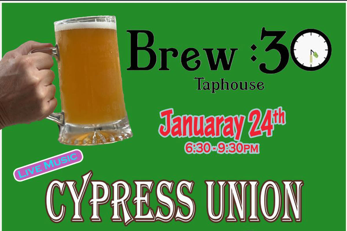 Live Music with Cypress Union at Brew30 Taphouse in Cypress is a laid-back Saturday night where neighbors can unwind, enjoy live tunes, and spend time together in a casual local setting.