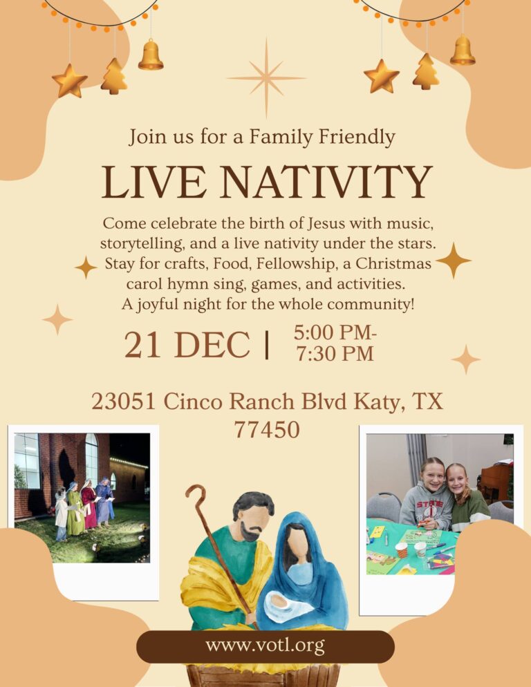 Live Nativity invites neighbors to gather on Cinco Ranch Blvd in Katy for a warm, family-friendly evening where the Christmas story is brought to life through music and storytelling.
