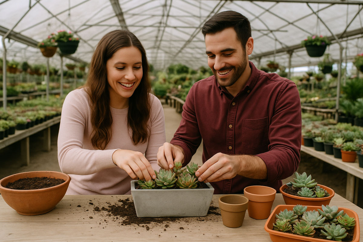 The on-site workshop provides materials, staff guidance, and a relaxed plant-focused atmosphere where participants can design and take home their own succulent containers.