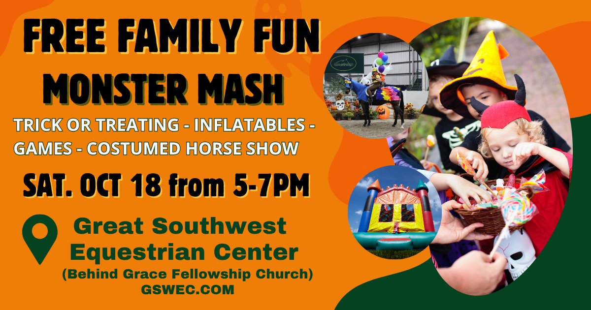 Get ready for a howling good time at this year’s Monster Mash—a family-friendly Halloween celebration at the Great Southwest Equestrian Center (GSWEC) in Katy, Texas! Families, friends, and even furry companions are invited to enjoy a festive evening filled with candy, costumes, and community fun.