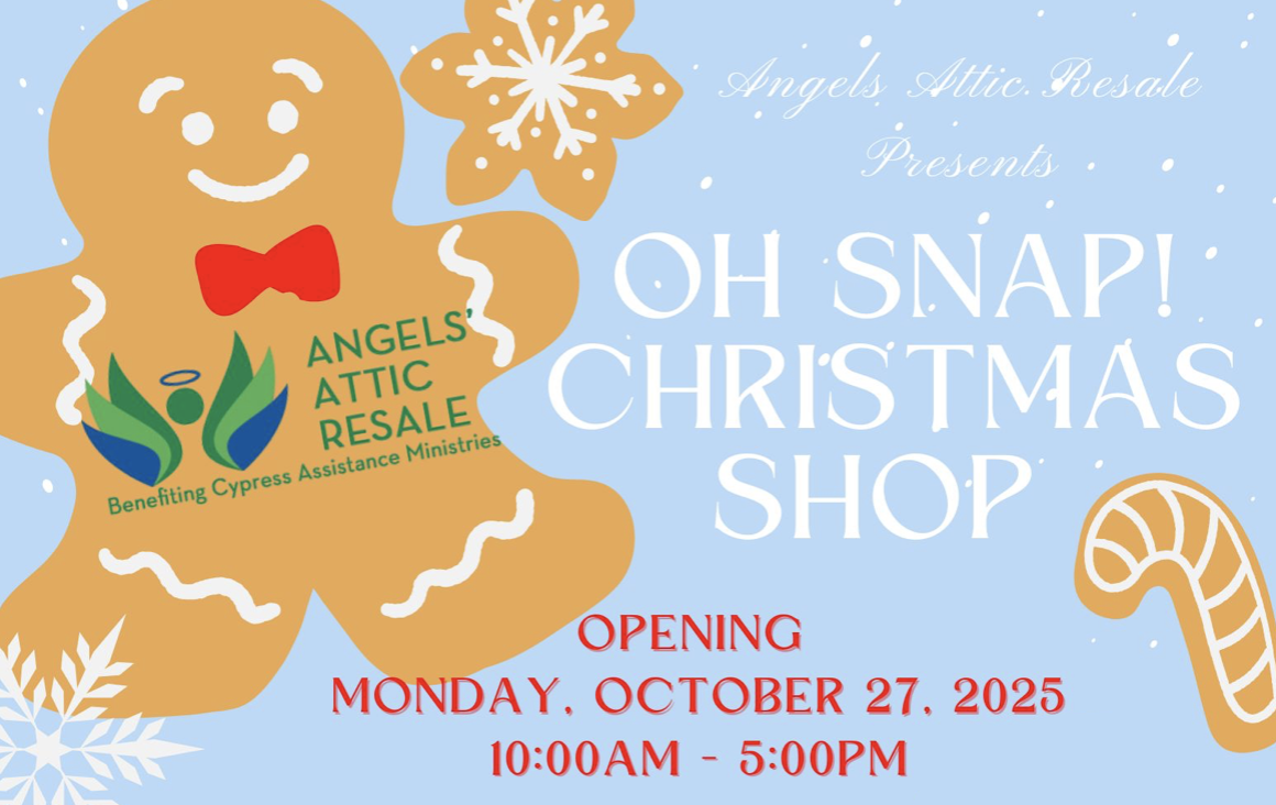 The holiday spirit is arriving early in Cypress and Willowbrook with the Oh Snap! Christmas Shop, presented by Angels’ Attic Resale benefiting Cypress Assistance Ministries. Opening Monday, October 27, 2025, from 10:00 a.m. to 5:00 p.m., this festive shopping event is a community favorite, offering seasonal décor, unique holiday finds, and plenty of Christmas cheer.