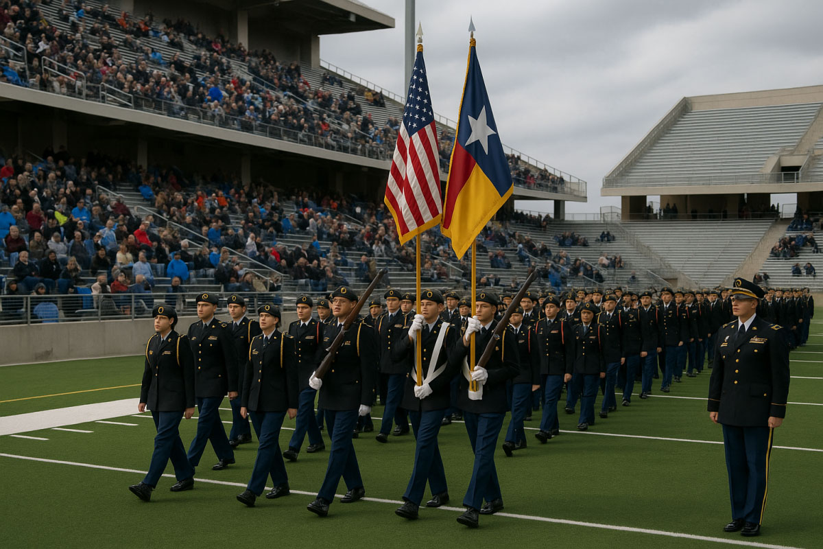 The Pass & Review ceremony at Cy-Fair FCU Stadium in Cypress is a community-oriented observance featuring marching units and official review exercises.