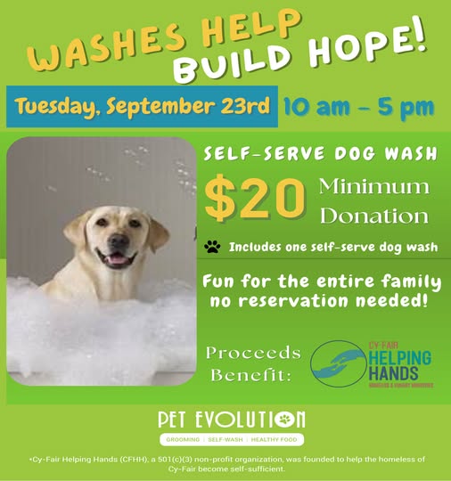 On Tuesday, September 23, 2025, from 10:00 am to 5:00 pm, Pet Evolution’s convenient self-wash stations will be available for just $20 per dog. It’s an easy, mess-free bath for your furry friend—and every dollar goes directly to Cy-Fair Helping Hands programs, which provide food, housing assistance, and supportive services to local families and individuals in need.