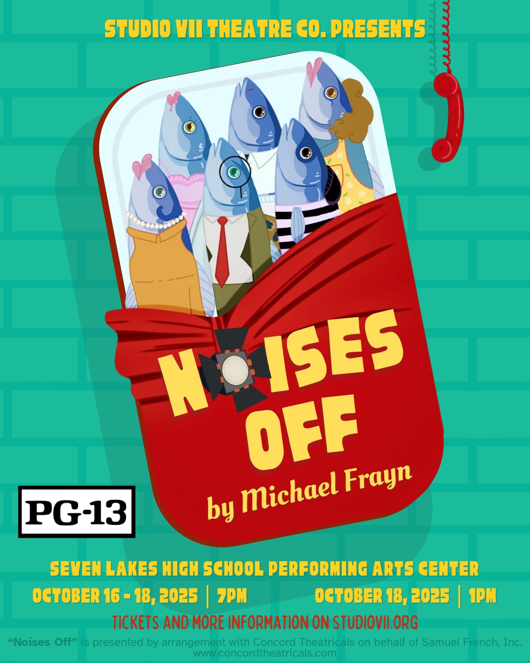Seven Lakes High School’s Studio VII Theatre Company presents Noises Off, Michael Frayn’s fast-paced comedy about a theatre troupe under observation from backstage, and the ensuing drama and comic chaos. Performances will be held October 16–18 at 7:00 p.m. and October 18 at 1:00 p.m. in the Seven Lakes High School Performing Arts Center (9251 S Fry Rd, Katy, TX). Rated PG-13 for comedic adult themes. Tickets go on sale October 5 at studiovii.org.