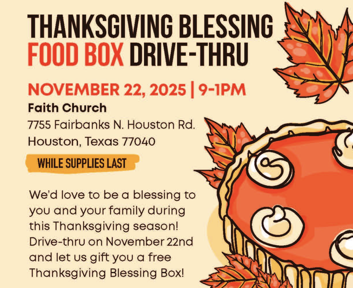 Faith Church is partnering with Cy-Fair Helping Hands to help local families celebrate the season with a full heart and table. On Saturday, November 22, 2025, from 9:00 a.m. to 1:00 p.m., the community is invited to a Thanksgiving Blessing Food Box Drive-Thru at Faith Church, located at 7755 Fairbanks N. Houston Rd., Houston, TX 77040.
