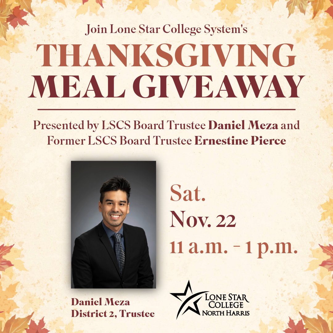 The Thanksgiving Meal Giveaway with Trustees Meza and Pierce at LSC–North Harris invites families from across Houston to come together in a spirit of gratitude and support at Lone Star College–North Harris in North Houston.