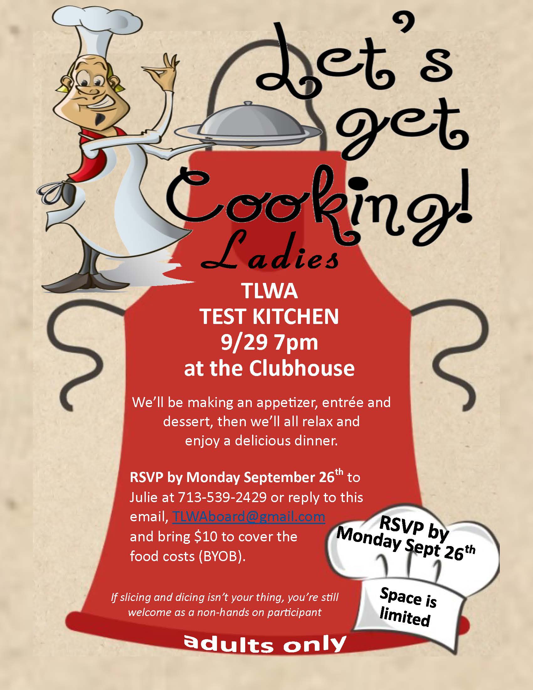 RSVP by Monday, September 26, to Julie at 713-539-2429 or send an email to TLWABoard@gmail.com. Please bring $10 to cover the food costs (BYOB).