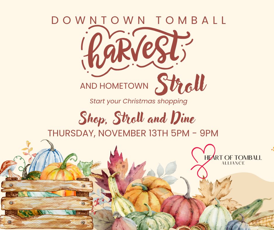 Fall shopping and stroll through Downtown Tomball as local shops stay open late for fall shopping and holiday prep. Neighbors gather to support Heart of Tomball Alliance members and enjoy local eateries.