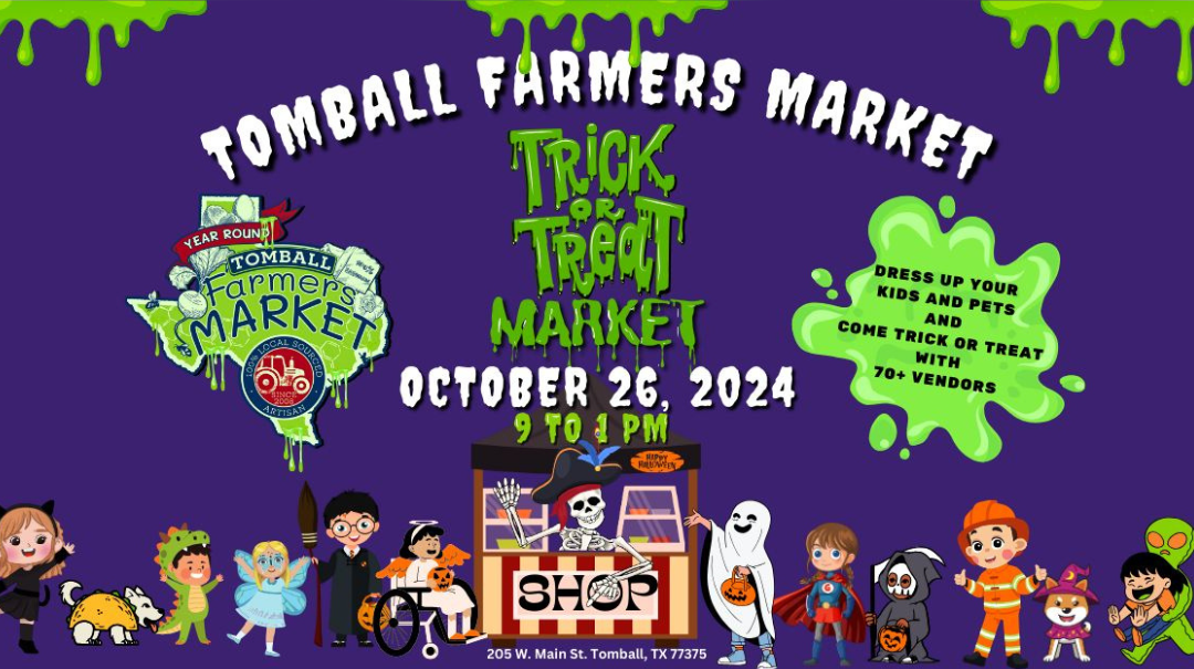 Hey neighbors, the Tomball Farmers Market invites families to join a Halloween-friendly Trick-or-Treat Market in Tomball, TX this Saturday at 205 W Main St.