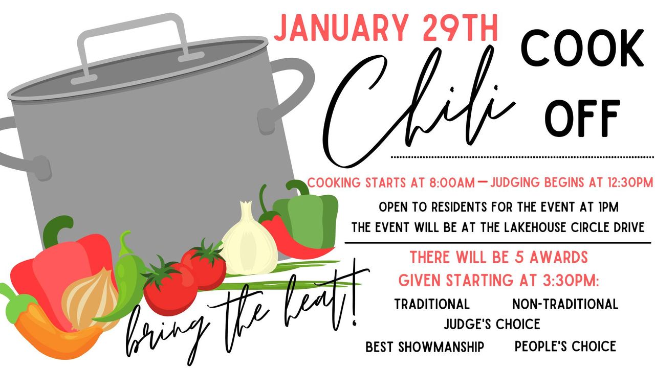 We want to welcome residents to this event starting at 1:00 PM on January 29th to enjoy delicious chili from your neighbors. You will also get to vote for your favorite team for our People's Choice Award!