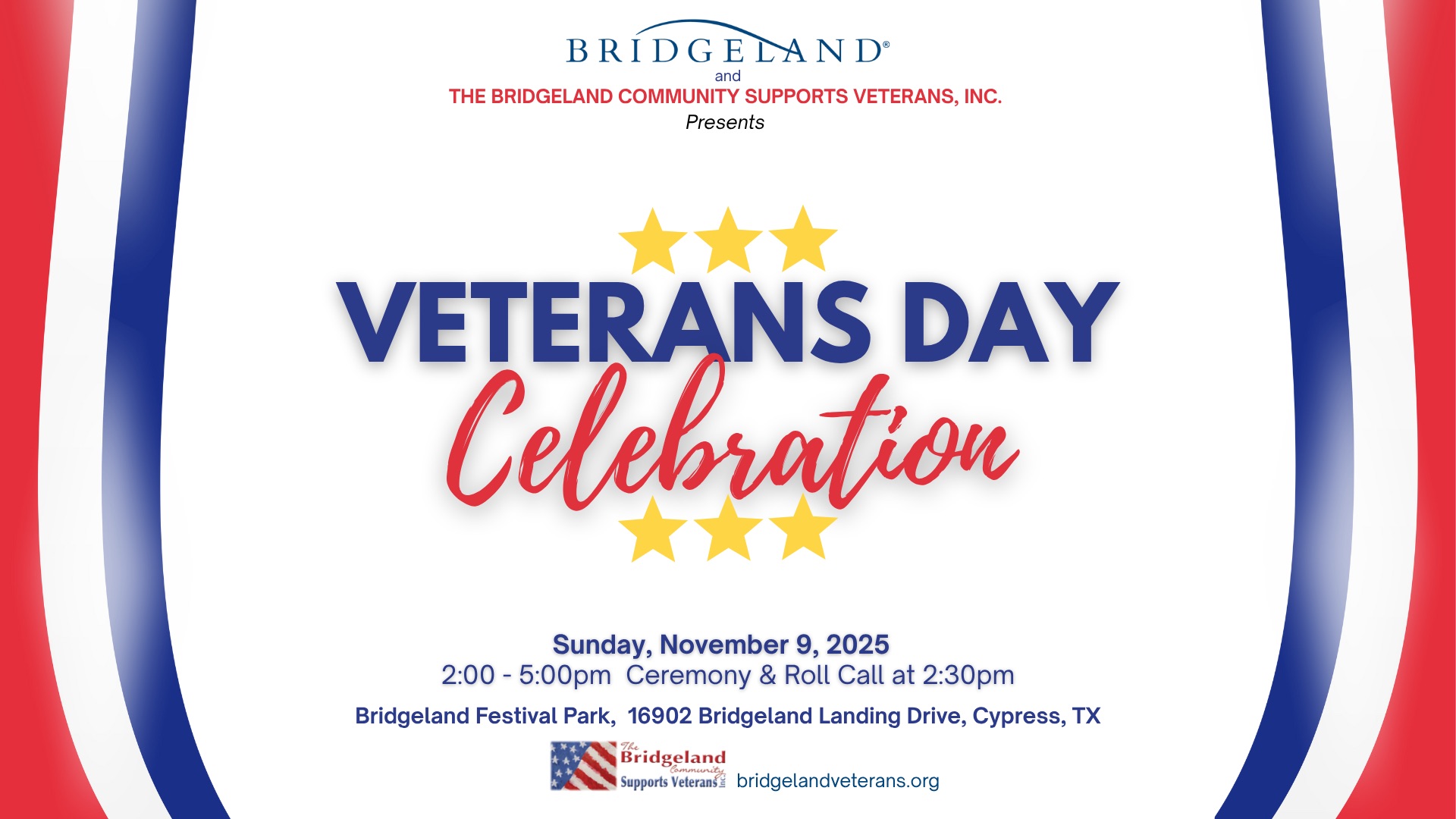Bridgeland residents and visitors alike are invited to gather for the Veterans Day Celebration on Sunday, November 9, 2025, from 2 to 5 p.m. at Bridgeland Festival Park, located at 16902 Bridgeland Landing Drive, Cypress, TX 77433. Hosted by The Bridgeland Community Supports Veterans, Inc., this annual event brings neighbors together to honor the men and women who have courageously served our country.