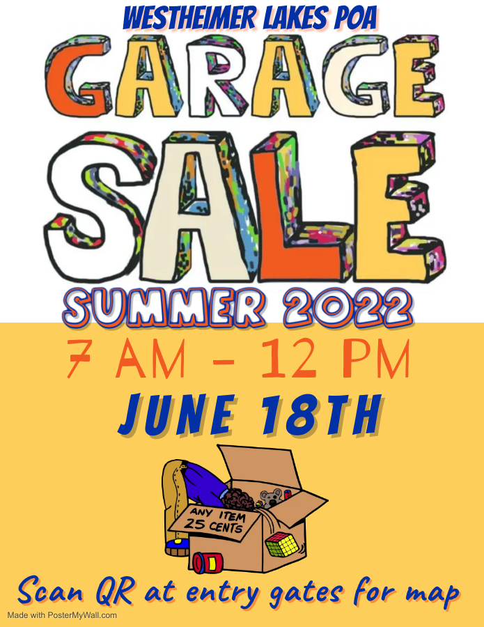 Your Westheimer Lakes neighborhood will hold its summer community garage sale on June 18th from 7 AM until 12 PM. Scan QR code located at entry gates for map of registered homes and what they are selling. Visit this website for more information on the day of the event (event website will only be active during the hours of the sale).