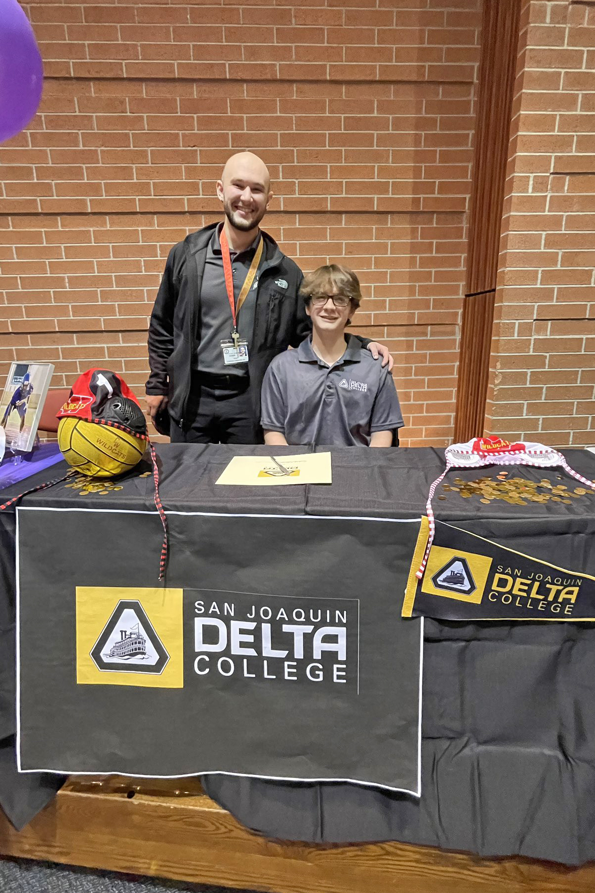 Cypress Woods High School senior Ewan Rios, seated, signed a letter of intent to play water polo at Delta College.