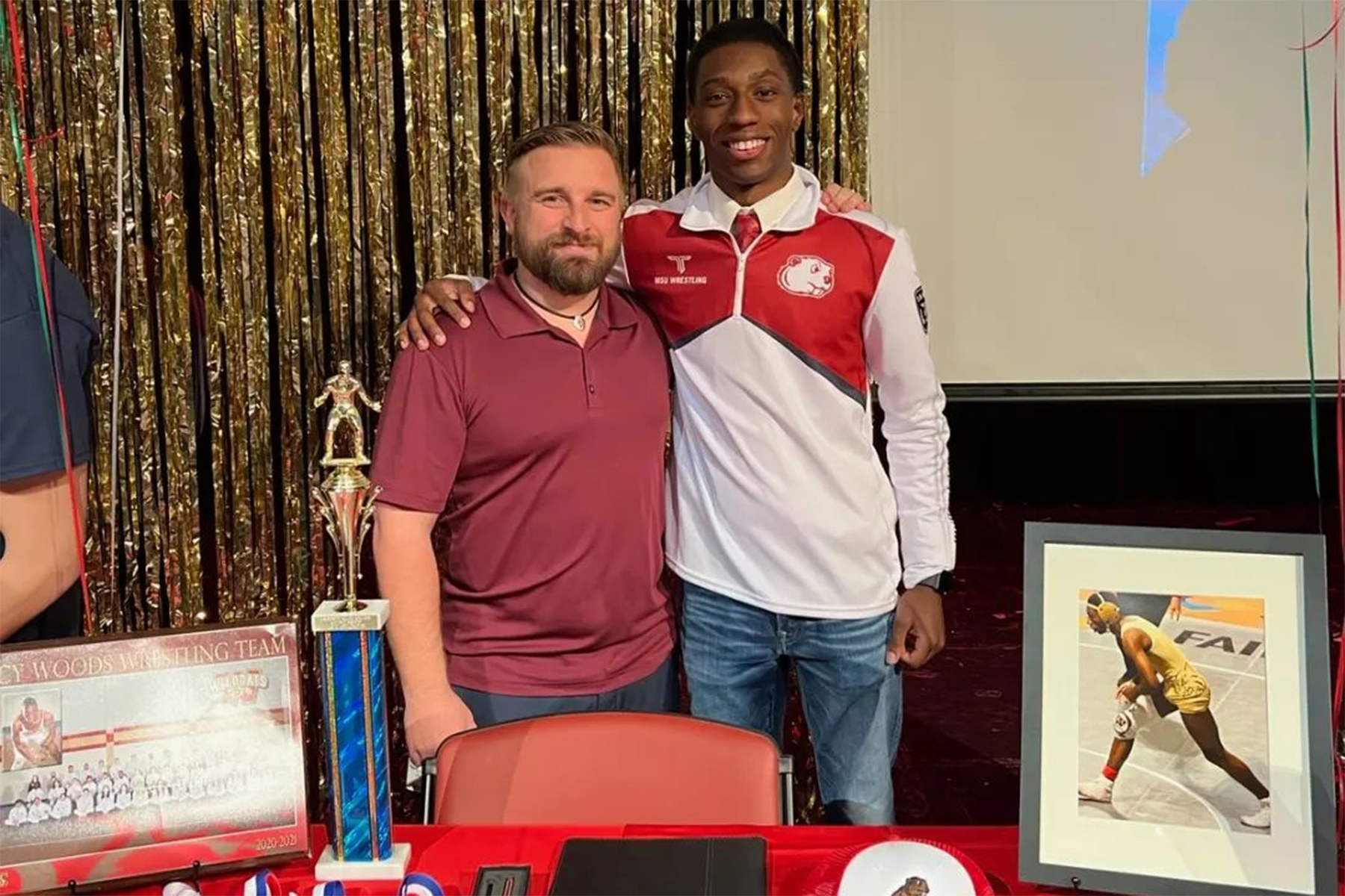 Cypress Woods High School senior Zion Webb, right, signed his letter of intent to wrestle at Minot State University.