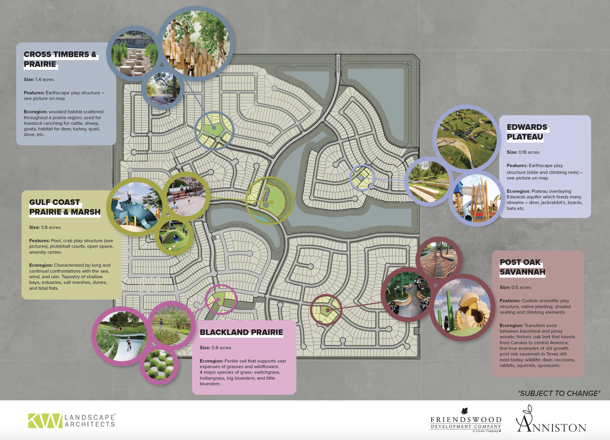 Covering 0.5 acres, the Post Oak Savannah will include a custom armadillo play structure and native plantings, providing shaded seating and climbing elements for children. This area represents a transition zone between blackland and piney woods and is home to diverse wildlife, enhancing the community's natural appeal.