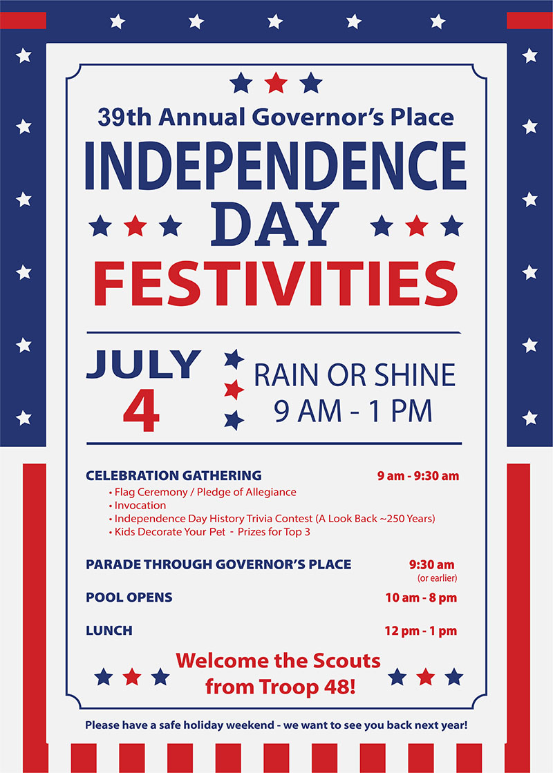 Mark your calendars and make plans to attend the 39th annual Governors Place Independence Day Festivities. We look forward to seeing you there!