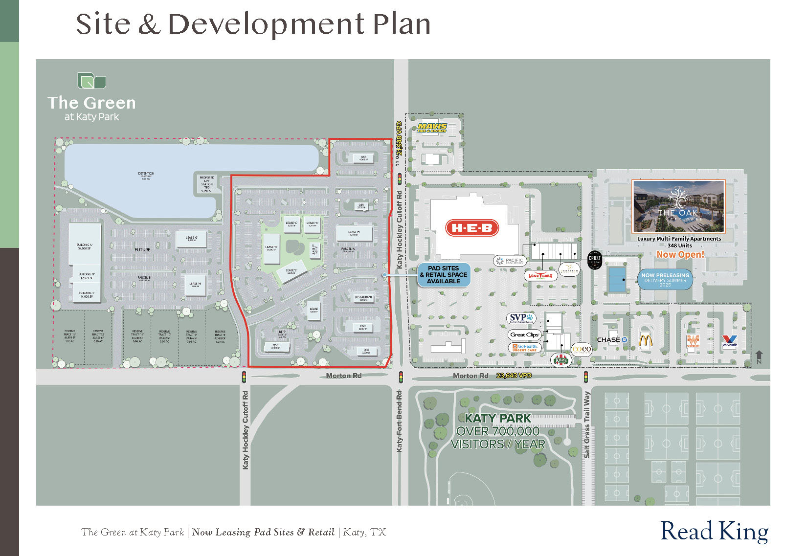 Phase one is being designed by Houston-based Boucher Design Group (BDG), an architecture firm with experience in restaurant, retail, and community-oriented commercial projects like LaCenterra at Cinco Ranch, Cypress Marketplace, and Stableside at Falcon Landing. The site sits directly across from Katy Park and within close range of high-traffic retailers like H-E-B, Whataburger, and McDonald’s.