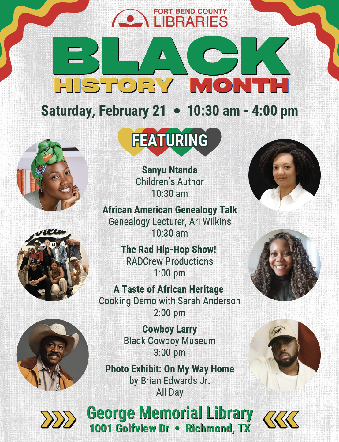 This February, Fort Bend County residents are invited to honor and celebrate Black History Month through a day of enriching, educational, and engaging activities at the George Memorial Library. On Saturday, February 21, from 10:30 a.m. to 4:00 p.m., the library will host a full slate of free programs for all ages at its Richmond location at 1001 Golfview Drive.