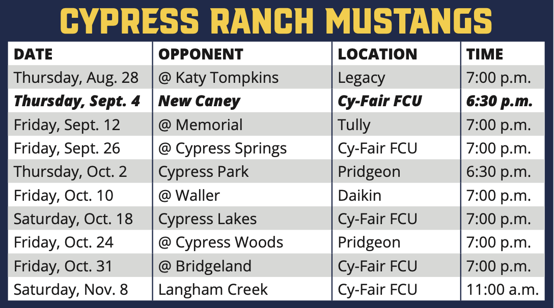 So pull on your navy and gold, gather your family, friends, and Cypress South neighbors and make plans to cheer on the Mustangs this season. The pride of Ranch Nation is alive and ready to stampede into the 2025 football season.