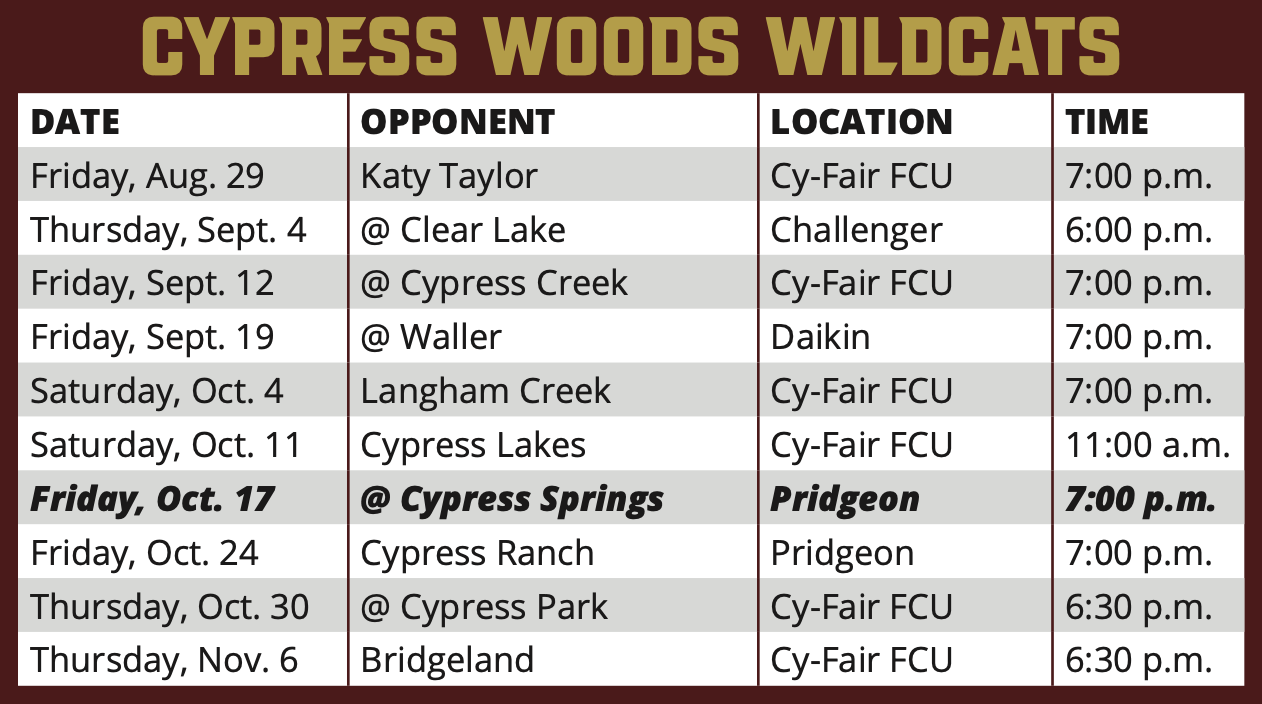 So put on your crimson and gold, call your neighbors, and join the Wildcats for Friday night football. The energy of Cypress Woods is something every family should experience this fall.