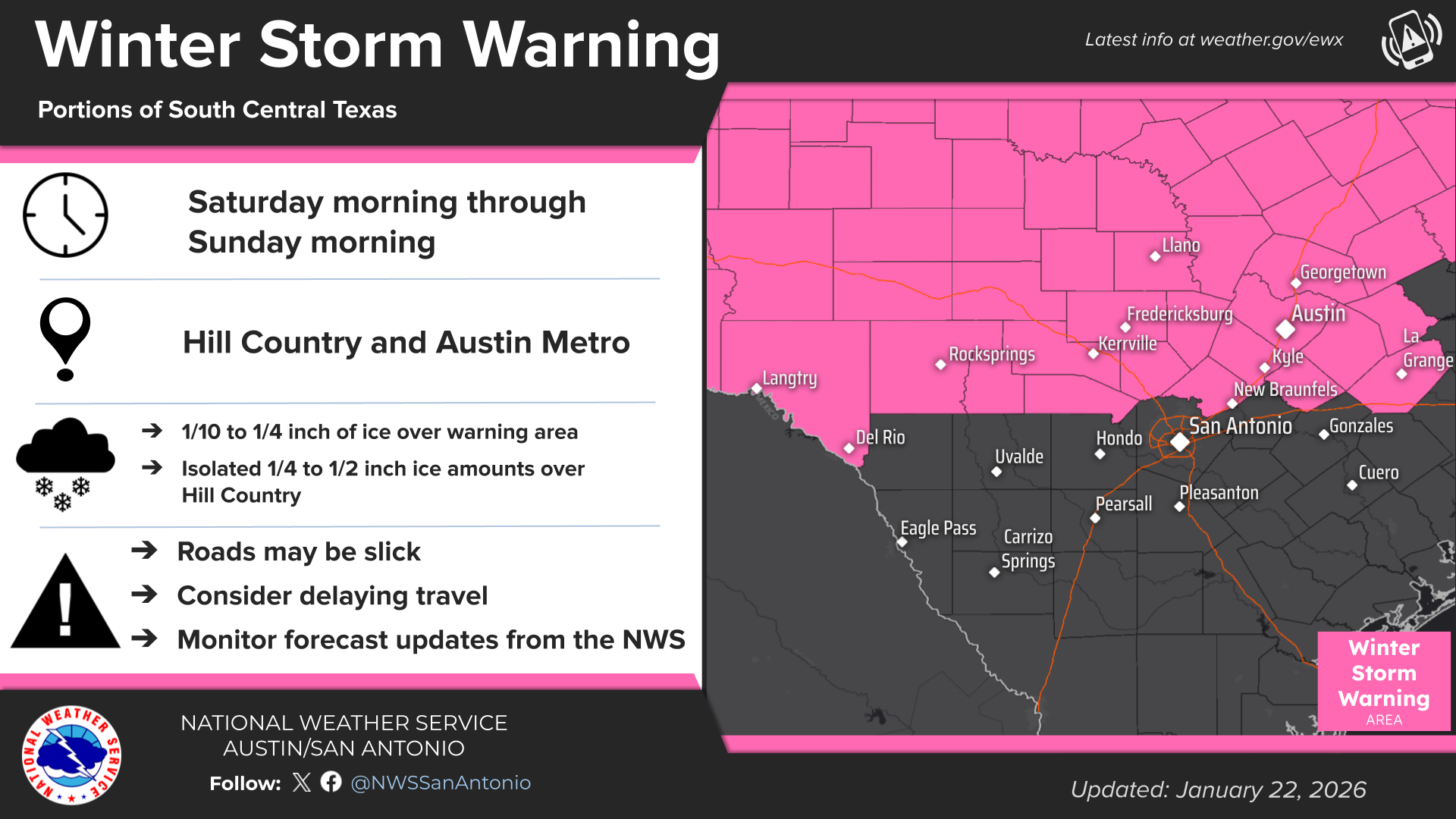 Starting Friday night and lasting through Monday, the region faces freezing rain, sleet, subfreezing temperatures, and wind chills as low as -5°F in the Hill Country. In some areas, temperatures may not rise above freezing for 48 hours, making icy roads and power outages a real concern.