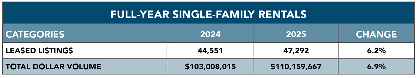 The rental market for townhomes and condominiums told a slightly different story in 2025. Full-year performance declined 3.9%, totaling 7,171 leased listings compared to 7,460 in 2024. Likewise, the total dollar volume dropped 4.3% year-over-year to just under $14 million.