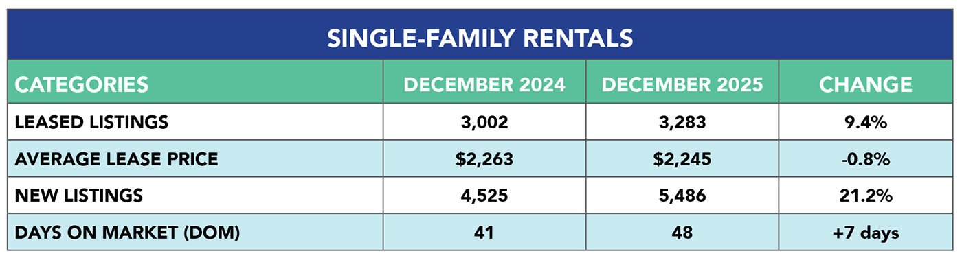 In December alone, single-family lease activity jumped 9.4%, with 3,283 leases signed, compared to 3,002 in December 2024. Rental inventory also surged, as 5,486 new listings hit the market—marking a 21.2% increase year-over-year.