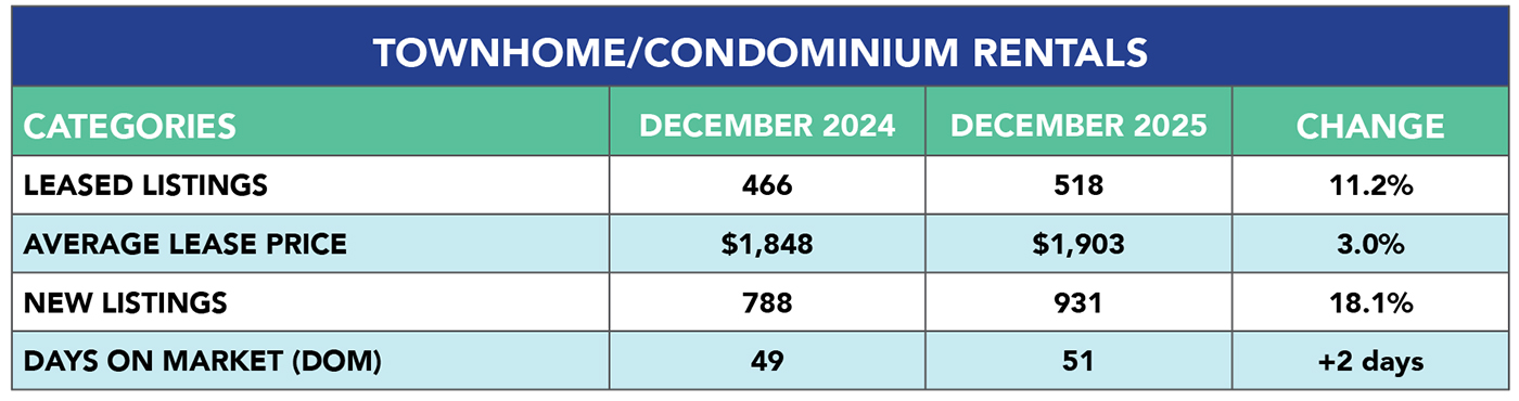 But the December numbers reveal a more encouraging trend. Townhome and condo rentals rose 11.2% from the previous December, with 518 leases signed, up from 466. The average lease price climbed to $1,903, marking a 3.0% gain, while the DOM increased modestly by two days, from 49 to 51 days.