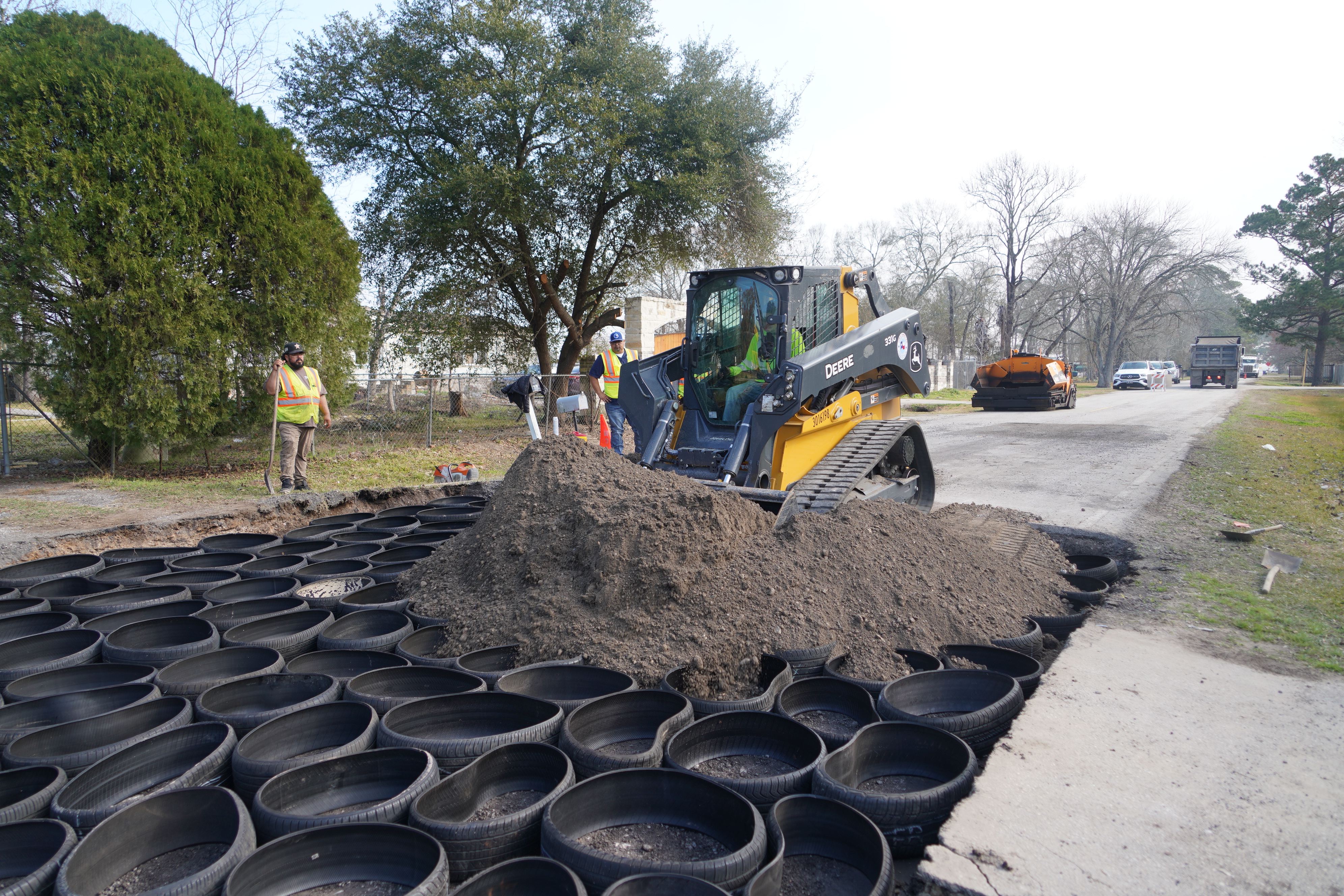 | Road and Bridge crews utilize an innovative road repair method using recycled tires as part of the roadway foundation in Harris County Precinct 3. (Source: HCP3) |