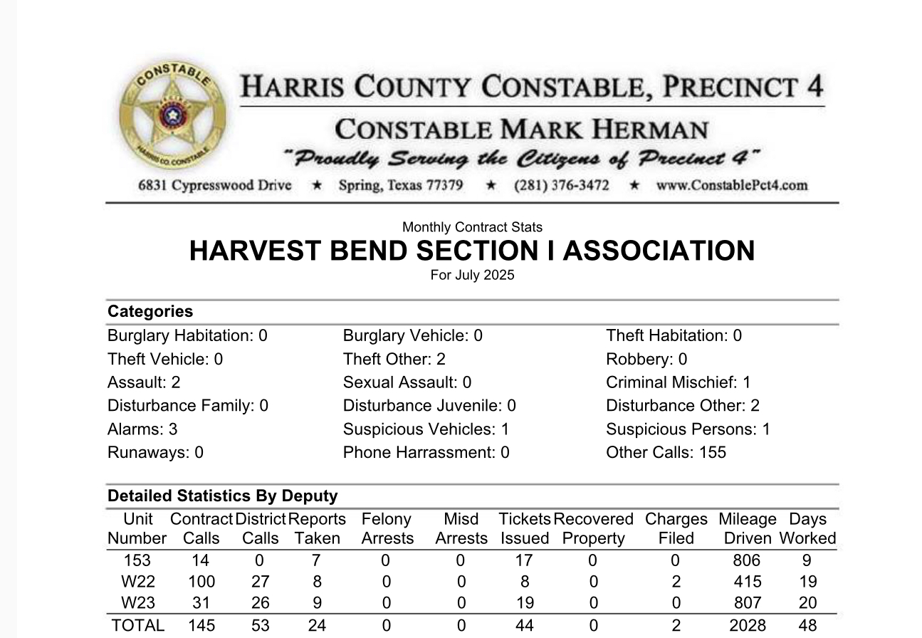 Remember, if you see suspicious activity or have a safety concern regarding Harvest Bend Section 1, please contact the Harris County Precinct 4 Constable's Office at 281-376-3472 for non-emergencies. As always, please call 9-1-1 for emergencies. For more information about Harris County Precinct 4 Constable's Office, please visit constablepct4.com.