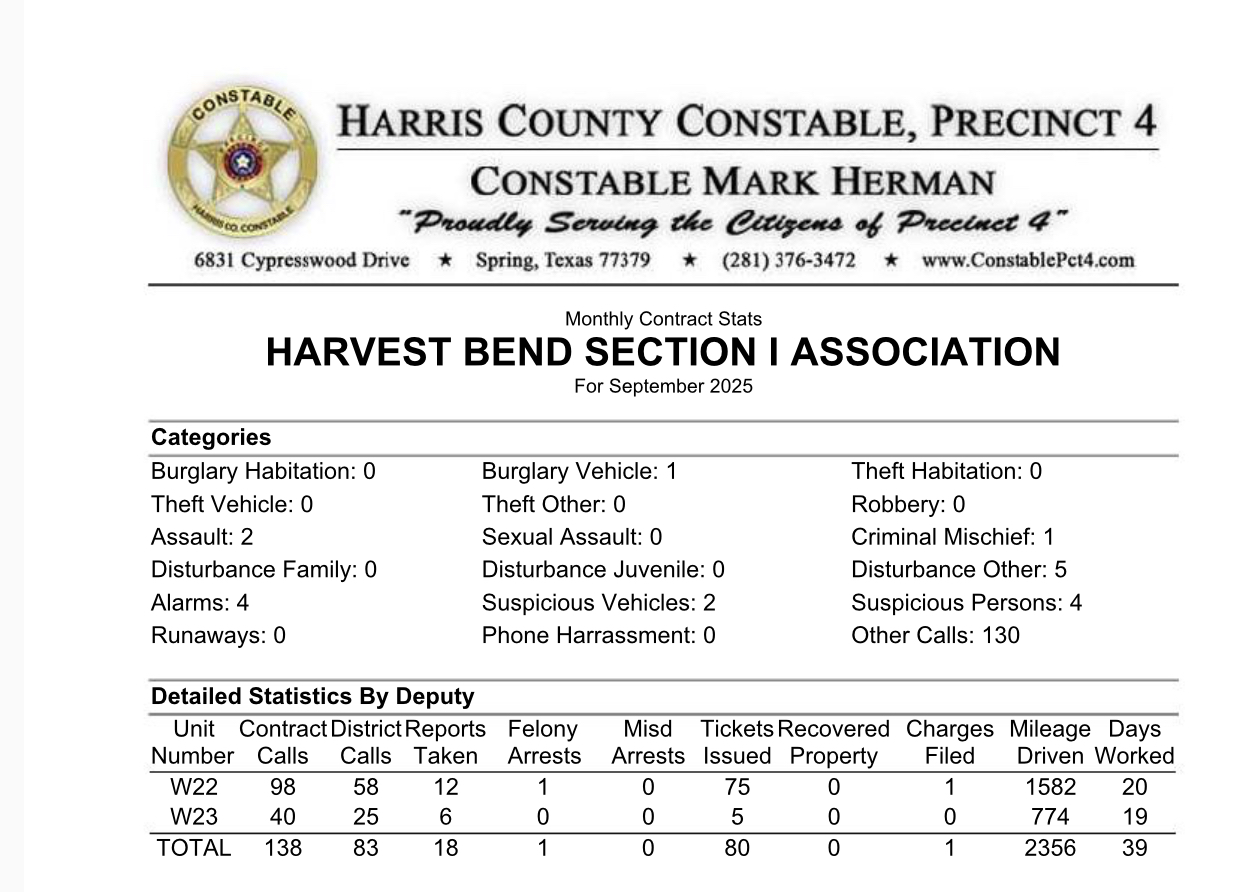 Remember, if you see suspicious activity or have a safety concern regarding Harvest Bend Section 1, please contact the Harris County Precinct 4 Constable's Office at 281-376-3472 for non-emergencies. As always, please call 9-1-1 for emergencies. For more information about Harris County Precinct 4 Constable's Office, please visit constablepct4.com.