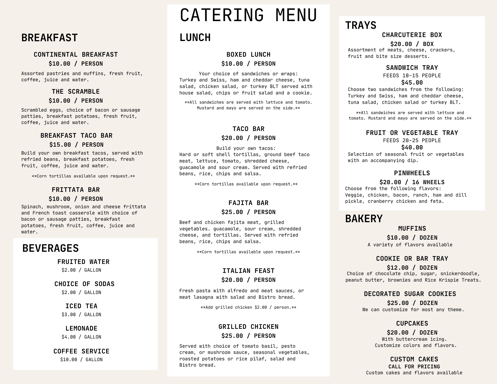 Interested in catering for your next event or staff meeting? Old Town Bistro also offers affordable catering services—check out the catering menu here and contact Ruth Delaney at 281-237-7580 or email RuthEDelaney@katyisd.org for details.