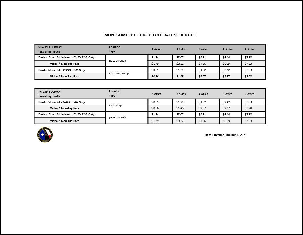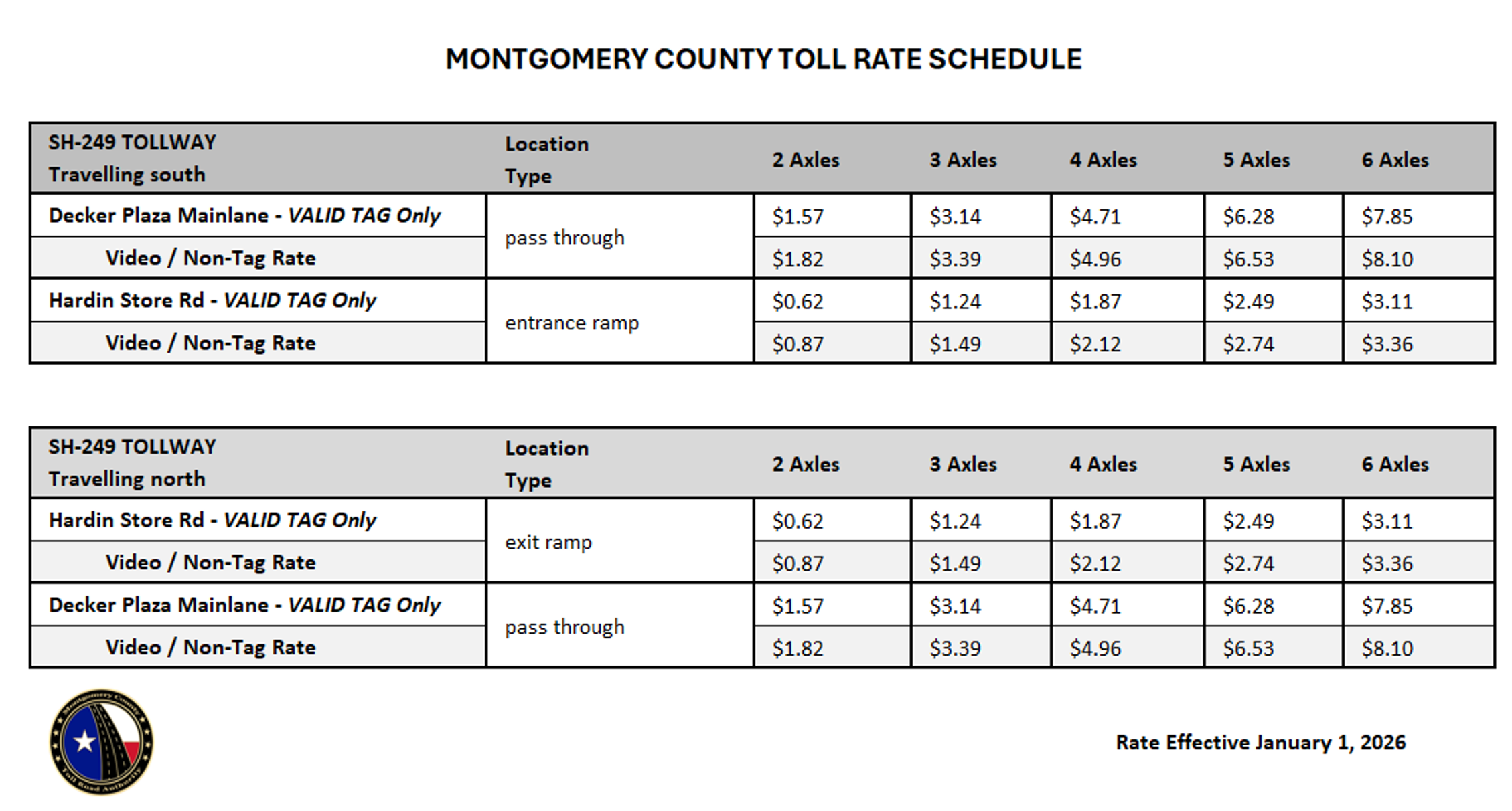 Drivers traveling the SH-249 Tollway in Montgomery County will soon pay more at the toll booths. The Montgomery County Toll Road Authority (MCTRA) has announced that new toll rates will take effect at 12:01 a.m. on January 1, 2026, reflecting modest increases across all vehicle classes.