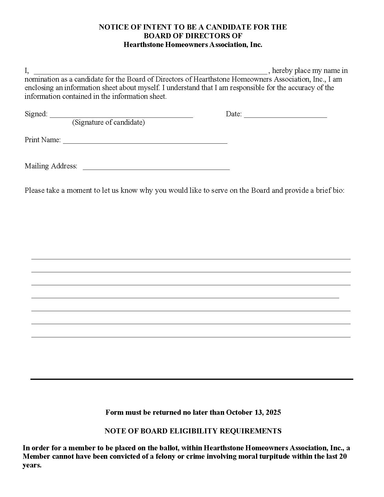 To be eligible for the Board, candidates must be current members of the Hearthstone HOA and must not have been convicted of a felony or a crime involving moral turpitude within the past 20 years. The nomination form also requests a short personal bio and a brief explanation of why the candidate wishes to serve.